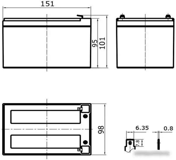 AGM, 12 В, 12 А·ч, макс. ток 180 А, клеммы F2, 151x98x95 мм, 3.9 кг, срок службы: 8 лет