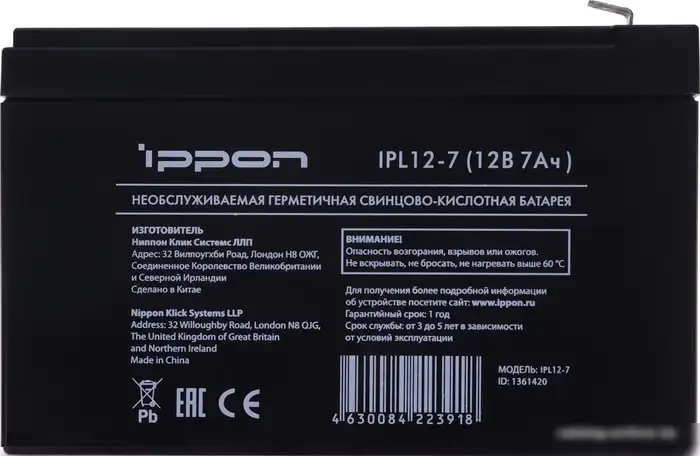 Аккумулятор для ИБП IPPON IPL12-7 (12В/7 А·ч)