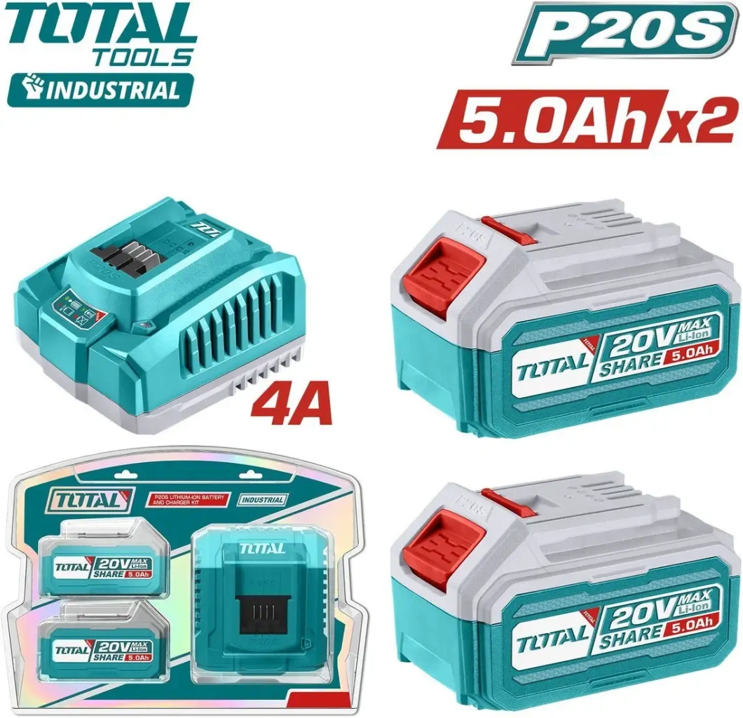 Li-ion, для строительного инструмента, совместим с Total, 20 В, 5 А·ч, с индикатором заряда, 2 аккумулятора в наборе, напряжение зарядного устройства: 20 В