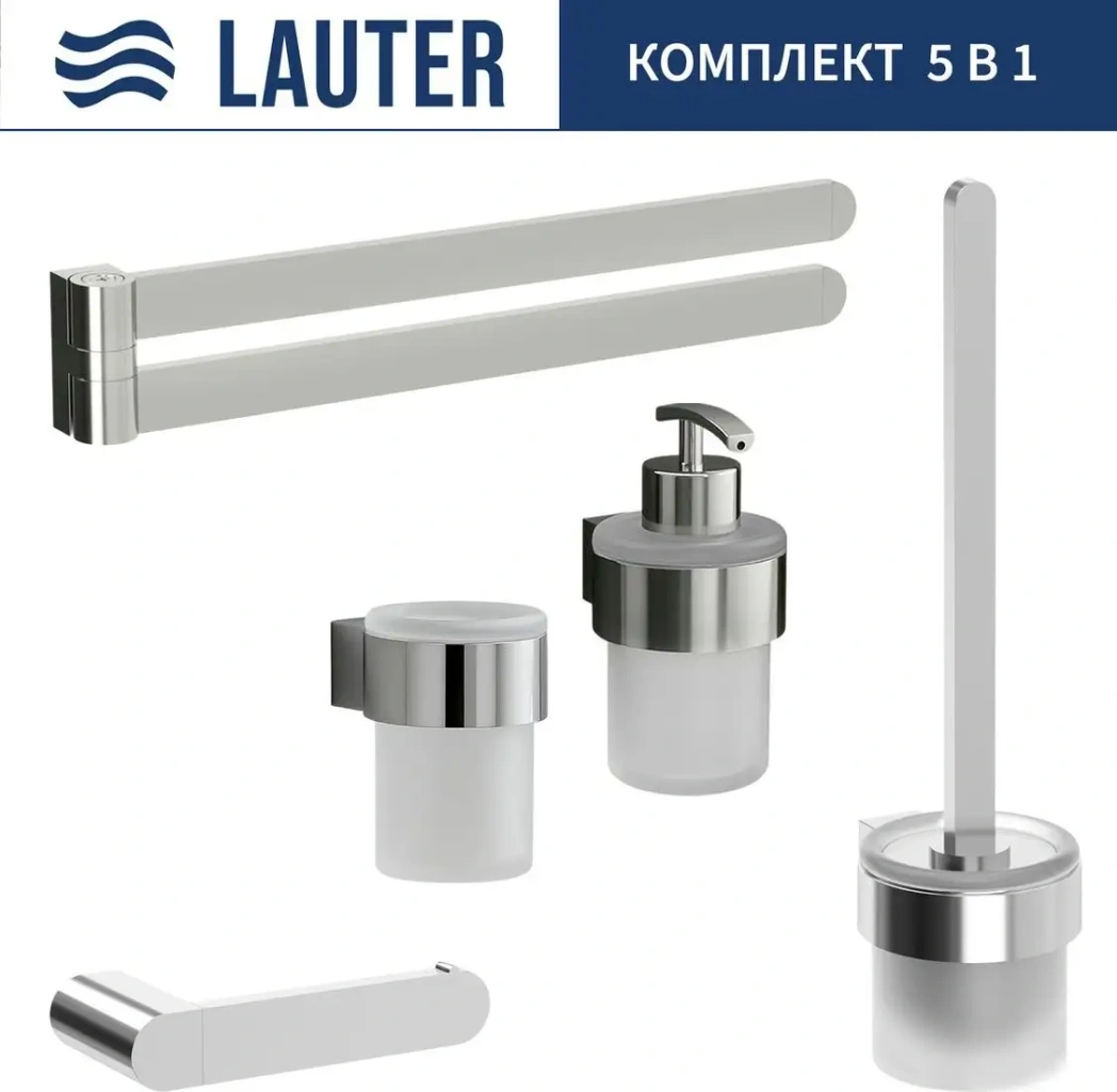 Набор аксессуаров для ванной Lauter включает пять практичных предметов, которые легко установить на стену с помощью болтов. Он состоит из держателя для полотенца, держателя для туалетной бумаги, стакана для зубных щеток, дозатора жидкого мыла и ершика для унитаза. Все элементы сделаны из прочных материалов — металла и стекла, что обеспечивает долговечность и стильный внешний вид. Округлая форма и хромированное покрытие придают набору современный и аккуратный вид. Благодаря настенной установке экономится место на полке и столешнице. Компактные размеры позволяют разместить все необходимые аксессуары в ванной легко и удобно. Все предметы легко моются и хорошо держатся на стене, что обеспечивает гигиеничность использования. Удобство использования достигается за счёт четкого размещения элементов и их продуманной конструкции. Такой набор подходит для тех, кто ценит порядок и стиль в ванной комнате.