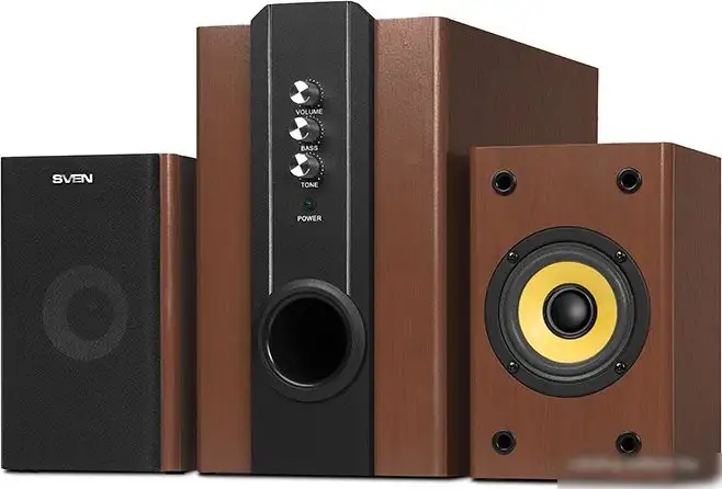 Акустика SVEN SPS-820 — это настольные колонки с мощностью 38 Вт, которые подходят для домашнего использования. Они выполнены из дерева, что обеспечивает хорошее звучание и долговечность. В системе есть два фронтальных динамика по 10 Вт и сабвуфер мощностью 18 Вт, что создает насыщенный звук с богатым басом. Колонки соединяются через линейный вход RCA, что удобно для подключения к разным устройствам. Управление осуществляется на корпусе — есть переключатели и регулятор громкости. Устройство работает только от сети, батарей не предусмотрено.