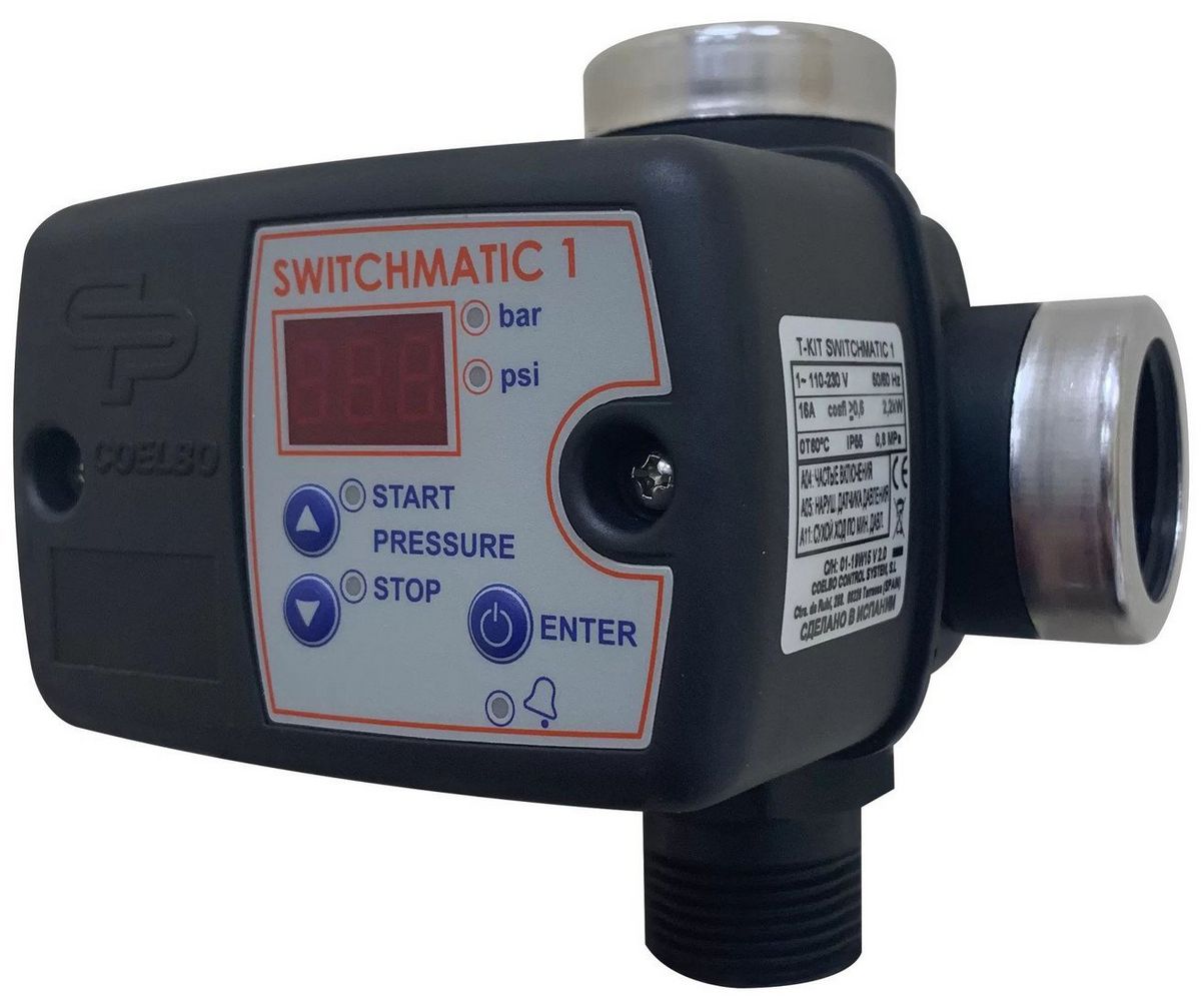 Электронный блок автоматики Coelbo T-KIT Switchmatic обеспечивает надежную работу системы благодаря электронному манометру и защите от сухого хода. Он подходит для подключения через наружную или внутреннюю резьбу, что упрощает установку. Устройство регулирует давление в диапазоне от 0.5 до 8 бар и работает с жидкостями при температуре от 1 до 45°C. Блок автоматике защищен от пыли и влаги по стандарту IP55, что обеспечивает долгий срок службы. Он работает от напряжения 220 В и обладает компактным весом — всего 0.7 кг. Это устройство помогает поддерживать постоянное давление и предотвращать поломки системы. Его легкая установка и надежность делают его удобным выбором для автоматизации систем водоснабжения.