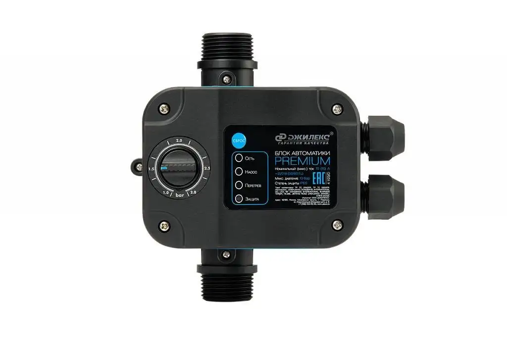 Блок автоматики Джилекс PREMIUM обеспечивает надежное управление насосом благодаря своей внешней резьбе для лёгкого подключения. Он оснащён манометром, который позволяет контролировать давление в системе, и защитой от сухого хода, чтобы предотвратить повреждение насоса при отсутствии воды. Устройство работает при давлении от 1 до 10 бар и перекачивает жидкость при температуре до 65°C. Класс защиты IP65 обеспечивает устойчивость к пыли и воде, что подходит для использования в различных условиях. Блок питается от сети 220 В и способен выдерживать ток до 10 А, что обеспечивает его долговечность. Он автоматически отключает насос при необходимости, помогая сохранить его исправность. Простое и надёжное устройство подходит для систем водоснабжения и отопления. Благодаря своей удобной конструкции, он легко монтируется и обслуживается.