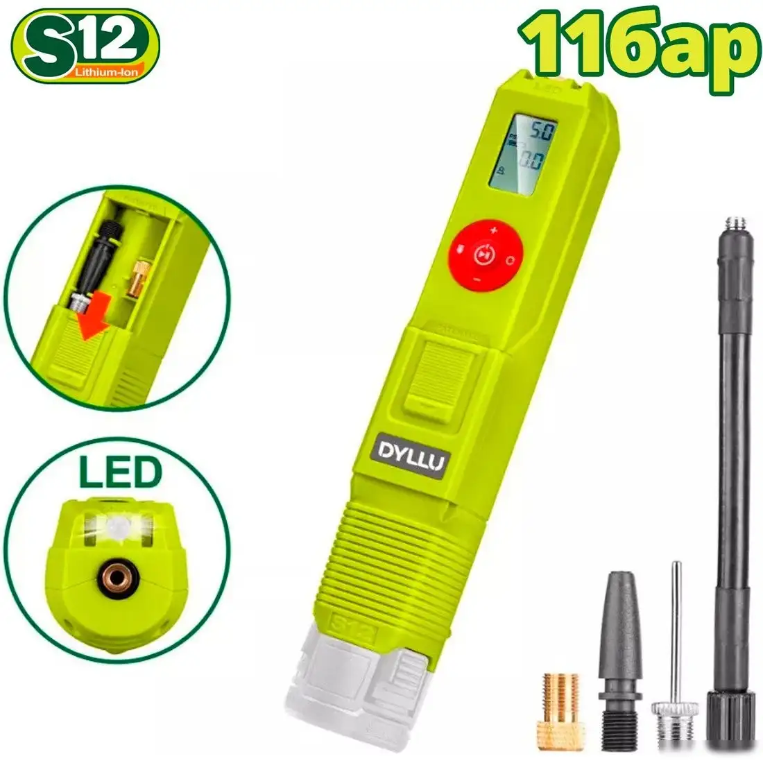 Автомобильный компрессор Dyllu DTLN1512 легко поможет на дороге благодаря своему цифровому дисплею, который показывает давление. Он работает от аккумулятора, который приобретается отдельно, что делает его универсальным и удобным. Максимальное давление устройства — 11 атм, что подходит для накачки шин. Компрессор оснащён креплением к колесу и ручкой для удобства установки и использования. В комплекте есть три адаптера, что позволяет использовать его для различных задач. Встроенный фонарь обеспечивает удобство работы в темное время. Его лёгкий вес — всего 0,425 кг, он легко помещается в багажник и пригодится в любой ситуации.