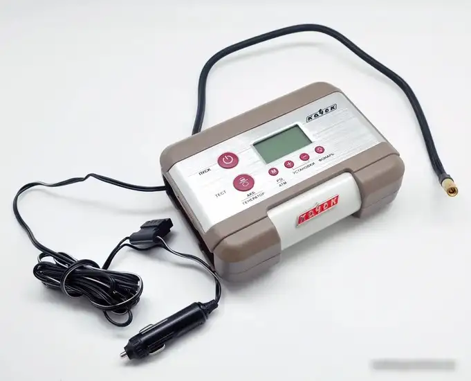Автомобильный компрессор Качок К60 New помогает быстро накачать колёса благодаря максимальному давлению 7 атм и производительности 35 л/мин. Он работает до 20 минут подряд, что удобно для долгих поездок или нескольких шин. Питание осуществляется от прикуривателя, что делает его удобным для использования в любой ситуации. На устройстве есть цифровой дисплей, который показывает давление в реальном времени, и манометр для точных измерений. Крепление к колесу легко закрепляется за счёт накручивающегося механизма. Встроенный фонарь помогает в условиях плохого освещения. В комплект входят переходные штуцеры для надувных изделий и инструкция по эксплуатации. Размеры компрессора небольшие — 21x15x6,5 см, и он весит всего 2 кг, что облегчает его транспортировку в багажнике.