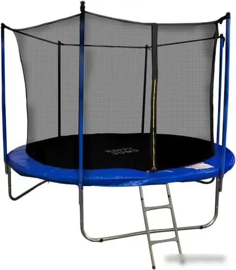 Батут Happy Jump 10ft-i Pro имеет круглый дизайн и зону для прыжков диаметром 300 см. Он крепится пружинами, которых 72, и стабильно держится на 3 опорах. Максимальная нагрузка составляет 150 кг, что подходит для всей семьи. Высота конструкции без сетки — 65 см, а с сеткой — 245 см, создавая безопасное пространство для прыжков. В комплект входит страховочная сетка и лестница для удобства входа. Надежная конструкция обеспечивает долгий срок службы и безопасность. Такой батут подойдет как для активных детей, так и для взрослых. Он выполнен в синих и черных тонах, что легко сочетается с разными участками двора. Простая сборка и компактный вес — 35.5 кг, позволяют быстро установить и убрать батут. Он создаст много ярких моментов и обеспечит здоровье и веселье.