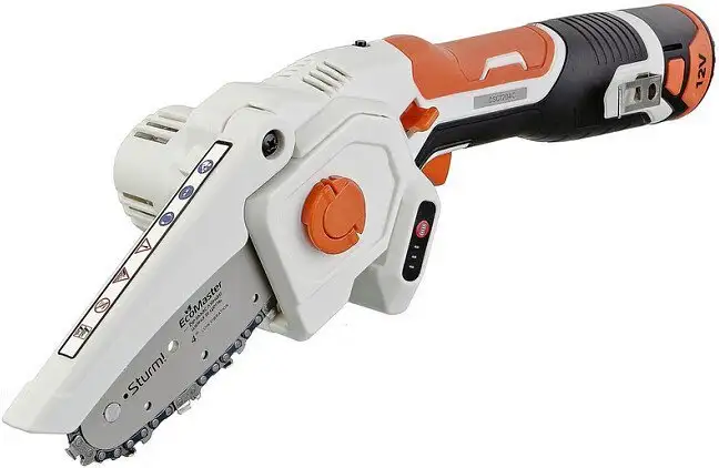 аккумуляторная, бытовая, 12 В, шаг цепи: 1/4 дюйма, длина шины: 10 см, аккумулятор в комплекте, быстрое натяжение цепи, 1.5 кг