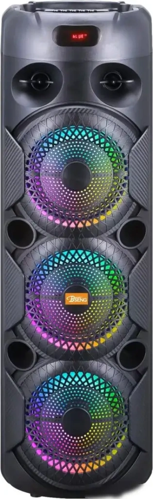 Патибокс Bseng MSA-8809 — это удобная портативная колонка для вечеринок с ярким дизайном и хорошим звуком. Она оснащена тремя динамиками, один из которых — широкополосный диаметром 20.3 см, что позволяет воспроизводить громкий и чистый звук. Колонка работает от аккумулятора емкостью 3600 мА·ч, а благодаря встроенной ручке легко переносится и переносит любую вечеринку. В устройстве есть встроенный дисплей с подсветкой и управление кнопками или пультом дистанционного управления. Поддерживаются беспроводные соединения через Bluetooth 5.0 с возможностью синхронизации двух колонок для стереозвучания. В колонке есть входы для аудиокабелей, микрофонный вход и разъем для зарядки USB Type-C. Она поддерживает MP3 с носителей USB и microSD, а также функцию караоке, радио и эквалайзера для улучшения звучания. Колонка оборудована микрофоном в комплекте, что делает ее идеальной для публичных выступлений и развлечений. Благодаря яркой подсветке создается праздничная атмосфера, а встроенный микрофон и динамическое управление делают использование простым и удобным. Компактные размеры позволяют легко разместить ее на любой площадке.
