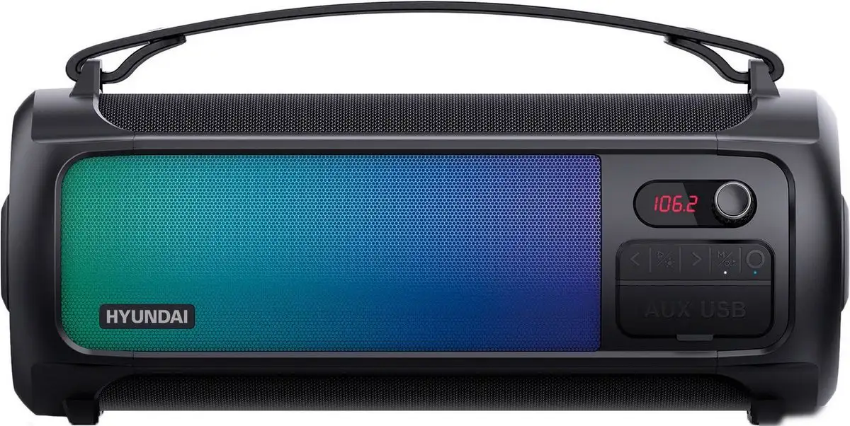 Беспроводная колонка Hyundai H-PS1025 предназначена для качественного звука в любой ситуации. У неё есть два динамика и пассивные излучатели, которые обеспечивают насыщенный и хороший звук. Колонка работает по Bluetooth 5.0, легко подключается к смартфону или другим устройствам, а также поддерживает передачу звука по кабелю через 3.5 мм и микрофонный вход для караоке. Её аккумулятор емкостью 3000 мА·ч позволяет играть до 10 часов без подзарядки. Встроенная подсветка и ручка делают её удобной для переноски и использования в разных местах. Также есть радио и возможность подключить внешние устройства через USB или кабель.