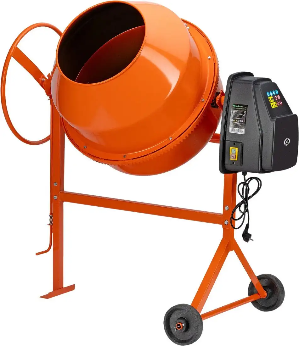 Бетономешалка СибрТех БСН-200 предназначена для приготовления строительных смесей. Она оснащена мощным двигателем 800 Вт, который обеспечивает хорошую работу при замесе. Объем барабана составляет 200 литров, а из этого объем готовой смеси — 96 литров, что позволяет делать большие объемы раствора за один раз. Корпус устройства окрашен в яркий оранжевый цвет, что делает его заметным на строительной площадке. Устройство имеет вес 59 кг, благодаря чему оно устойчиво и надежно во время работы. Размеры бетономешалки удобны для транспортировки и хранения.