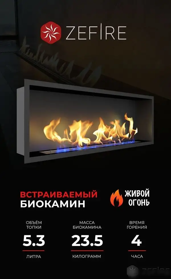 Биокамин ZeFire Flagman 1300 — это современное встроенное устройство, выполненное из МДФ и металла в черном цвете. Он создает эффект живого огня с помощью трехмерной имитации огня длиной 90 см, что придает помещению уют и уютность. Биокамин не требует подключения к электросети, так как не оснащен системой обогрева, и не занимает много места благодаря компактным размерам. Для поддержки огня используется заправка объемом 5,3 литра, что обеспечивает длительный эффект без постоянных подзарядок. Устройство легко интегрируется в современный стиль интерьера и подходит для различных помещений, делая их более привлекательными.