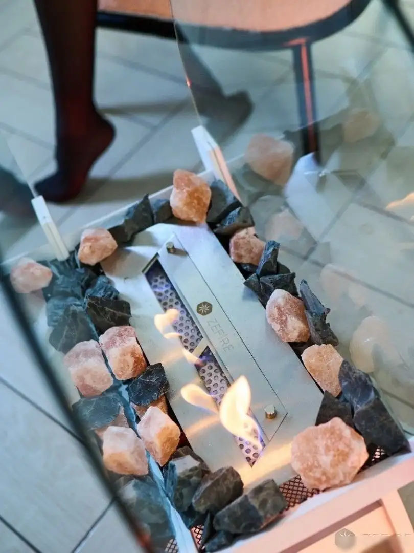 Биокамин ZeFire Iris — это современный отдельно стоящий камин, выполненный из металла, дерева и стекла. Он создает уютный вид с панорамным стеклом, через которое видно эффект 3D-огня и имитацию камней. Благодаря виртуальному пламени, он выглядит очень реалистично. У камина есть режим "без нагрева", что позволяет использовать его для создания атмосферы без тепла. Он оснащен линией огня длиной 25 см и легко заправляется, расходуя 1,2 литра топлива. Размеры камина: ширина — 51 см, глубина — 24 см, высота — 70 см. Такой дизайн отлично впишется в современный интерьер. Он не создает тепла, поэтому подходит только для визуальных целей и украшения комнаты. Камин просто устанавливается и легко обслуживается.