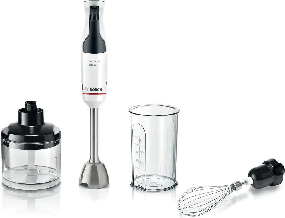 Погружной блендер Bosch MSM4W221 — удобный и надежный помощник на кухне. Он работает от электросети и мощностью 600 Вт, что позволяет быстро и легкоготовить разные блюда. Блендер имеет многоступенчатую регулировку скорости, чтобы выбрать оптимальный режим для ваших задач. В комплект входит мерный стакан и венчик для взбивания, что делает его еще более удобным. Корпус изготовлен из пластика, а ножка — из металла, что обеспечивает прочность и долговечность устройства. Длина провода составляет 1,4 метра, а вес всего около 1200 граммов, что позволяет комфортно его использовать. Такой блендер отлично подойдет для взбивания, измельчения и приготовления пюре.