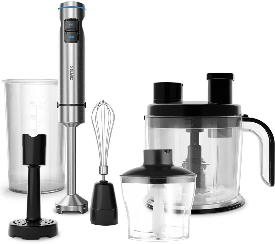 Погружной блендер CENTEK CT-1317 — удобное устройство для приготовления различных блюд. Он работает от электросети и имеет мощность 1500 Вт, что позволяет быстро и эффективно измельчать продукты. Блендер оснащен 15 скоростями и функцией «Турбо», что помогает точно регулировать мощность и добиваться нужной консистенции. Корпус и ножки сделаны из металла, а цвет — из нержавеющей стали, что обеспечивает долговечность и стильный внешний вид. В комплекте есть мерный стакан на 0.8 л, венчик для взбивания, насадки для пюре, замешивания теста и вспенивания молока, а также измельчитель и диски для нарезки и шинковки.