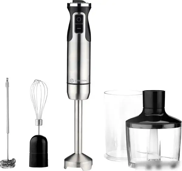 Погружной блендер Evolution HBS-1041 Black работает от сети и имеет мощность 1500 Вт, что помогает быстро и качественно смешивать продукты. Он оснащён 8 скоростями и функцией «Турбо», позволяя легко регулировать скорость для разных задач. Корпус и ножки выполнены из металла, что обеспечивает долговечность и прочность устройства. Блендер поставляется с мерным стаканом на 0,6 литра, венчиком для взбивания и вспенивателем молока, что удобно при готовке. Устройство удобно крепится на стену, занимая мало места. Насадка для измельчения помогает дробить продукты, а функция многоступенчатой регулировки скоростей облегчает работу с различными ингредиентами. Устройство не имеет функции колки льда или управления со смартфона, но отлично подходит для взбивания, смешивания и измельчения.