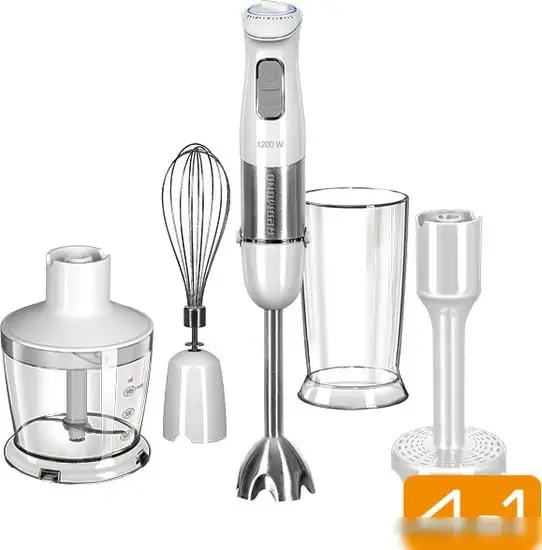 - Комплектация мерным стаканом и насадками — облегчает подготовку блюд и взбивание.