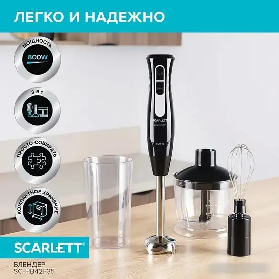 Погружной блендер Scarlett SC-HB42F35 предназначен для приготовления различных блюд и напитков. Он работает от сети и имеет мощность 800 Вт, что позволяет легко справляться с разными задачами. Устройство оснащено двумя скоростями и режимом «Турбо» для более быстрой работы и увеличенной мощности. Корпус сделан из прочного пластика, а ножка — из металла, что обеспечивает долговечность и устойчивость. В комплект входит мерный стакан на 0.6 литра и венчик для взбивания, что расширяет возможности при работе. В блендере есть функция измельчения продуктов, например, овощей и фруктов. Его длина составляет 285 мм, а вес — 1200 г, что делает его удобным в использовании. Благодаря хорошему балансу веса и компактным размерам, устройство удобно держать в руке и хранить в кухонных ящиках.