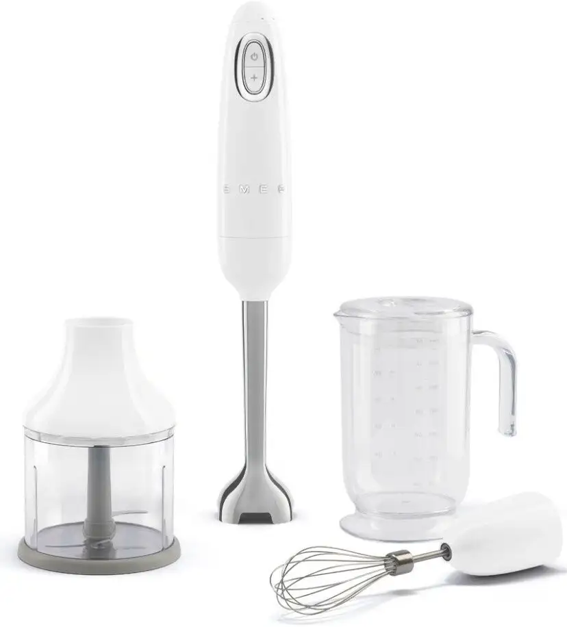 Погружной блендер Smeg HBF03WHEU — надежное устройство для приготовления блюд и напитков. Он работает от сети и имеет мощность 700 Вт, что позволяет легко измельчать и взбивать продукты. Блендер оснащен пятью скоростями и режимом «Турбо», чтобы регулировать работу под свои нужды. В комплект входит мерный стакан на 1,4 литра и венчик для взбивания, что делает его универсальным помощником в кухне. Корпус сделан из пластика, а ножки — из металла, что обеспечивает прочность и долговечность. Длина провода 1,5 метра дает свободу перемещения при использовании. Блендер легко управляется с помощью кнопок, а его размеры позволяют удобно хранить. Он отлично подойдет для смешивания, нарезки и взбивания продуктов, делая готовку проще и быстрее.
