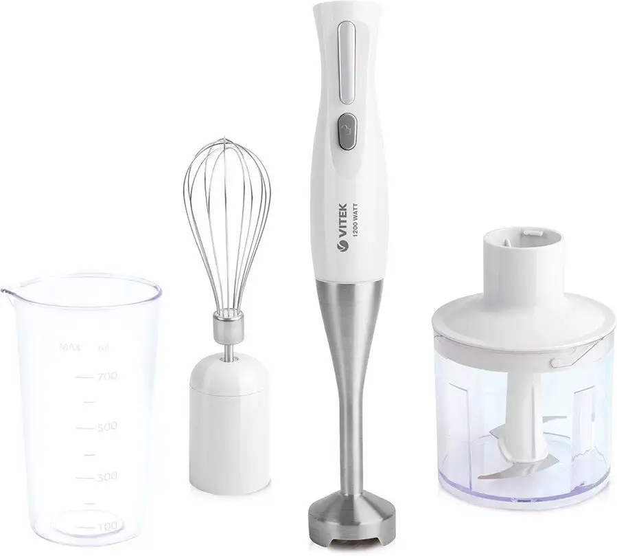Погружной блендер Vitek VT-8536 легко справляется с множеством задач на кухне. Его мощность в 1200 Вт позволяет быстро измельчать продукты и взбивать ингредиенты, а металлическая ножка обеспечивает долговечность и надежность. Устройство работает от электросети с длиной кабеля 1.1 метра, что дает свободу действий на кухне. Управление осуществляется простым нажатием, без дополнительных настроек для скорости. В блендере есть режим «Турбо», который помогает справиться с особо твердыми продуктами, например, льдом. В комплект входит мерный стакан на 0.7 литра для точного дозирования ингредиентов. Также есть венчик для взбивания и емкость для измельчения объемом 0.5 литра. Блендер выполнен из пластика с металлической ножкой и имеет белый корпус. Он отлично подходит для приготовления пюре, смузи и других блюд дома.