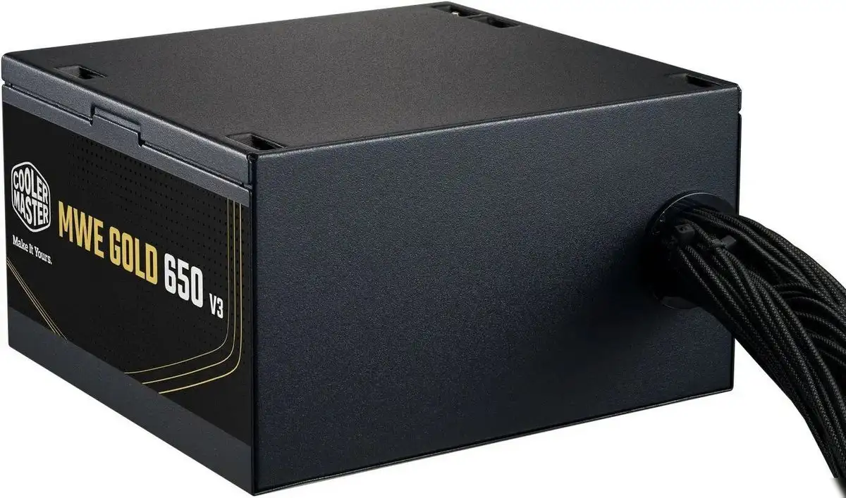 Блок питания Cooler Master MWE Gold 650 V3 обеспечивает стабильную работу компьютера с мощностью 650 Вт и высоким энергетическим КПД — 90%. Он выполнен в стандартном форм-факторе ATX12V 3.1 и подходит для большинства настольных систем. Блок поддерживает диапазон входного напряжения 100–240 В и имеет одну вентилятор диаметром 120 мм, который охлаждает устройство и обеспечивает тихую работу благодаря гидродинамическому подшипнику. Он оснащён активной коррекцией фактора мощности (PFC), что способствует более эффективной работе и уменьшает нагрузку на электросеть. В его разъёмах есть все необходимые для современного ПК соединения: 24-pin, CPU 8-pin, PCIe 6+2-pin и SATA. Кабели выполнены в оплетке, что облегчает их укладку и защищает от износа. Этот блок питания не модульный, что немного усложняет его сборку и обслуживание. Он компактный, весит всего 1,7 кг и легко размещается в корпусах стандартных размеров.