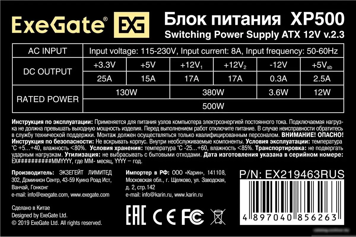 Блок питания ExeGate ATX-XP500 обеспечивает мощность 500 Вт, что подходит для большинства домашних компьютеров. Он имеет форм-фактор ATX и стандарты ATX12V 2.3, что обеспечивает совместимость со многими материнскими платами. Блок оснащён двумя линиями +12V, которые стабильно питают основные компоненты системы. Он обеспечивает максимальный ток по линии +12V в 17 А, что дает хорошую поддержку для комплектующих. Внутри установлен 120-мм вентилятор, обеспечивающий тихую работу и эффективное охлаждение. Блок питания не имеет модульного подключения кабелей и подсветки вентилятора, что снижает уровень шума. Он подключается к материнской плате через 20+4 pin разъем и обладает дополнительными разъемами для процессора, видеокарт, жёстких дисков и USB. Размеры модели компактны: высота 86 мм, ширина 150 мм и глубина 140 мм, что удобно для сборки в корпусах с ограниченным пространством. Поставляется в розничной упаковке, готов к использованию сразу после покупки.
