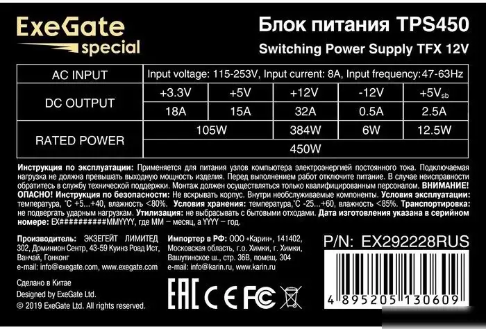 Блок питания ExeGate TPS450 EX292228RUS обладает мощностью 450 Вт и форм-фактором TFX, что позволяет легко установить его в небольшие корпуса. Он поддерживает стандарт ATX12V 2.3 и имеет одну линию +12В с током до 32 А, обеспечивая стабильное питание компонентов. КПД блока составляет 72 %, что помогает снизить энергопотери и нагрузку на сеть. В нем установлен гидродинамический вентилятор диаметром 80 мм, который работает тихо — до 35 дБ — и эффективно охлаждает устройство. Множество разъемов позволяет подключать разные компоненты — от материнской платы до видеокарт и накопителей. Модель не имеет модульного подключения кабелей, что немного усложняет организацию проводки. Этот блок подходит для сборок, где важна надежность и минимальный шум. Комплектация включает все необходимые кабели и элементы для установки и запуска оборудования.