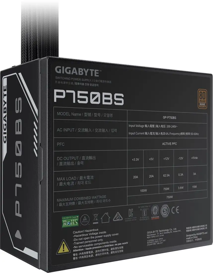 Блок питания Gigabyte P750BS мощностью 750 Вт подходит для большинства ПК. Он выполнен в форм-факторе ATX и отличается высоким КПД — 88 %, что помогает экономить энергию. Оборудован одной линией +12V, которая обеспечивает стабильную работу компонентов. Встроенный вентилятор диаметром 120 мм с гидродинамическим подшипником работает тихо и эффективно охлаждает устройство. Блок полностью совместим с стандартами 80 PLUS Bronze и сертифицирован по PFC для повышения энергопотребления. Кабели выполнены в оплетке, что облегчает их организацию внутри корпуса. Модель включает необходимые разъемы: 20+4 pin для материнской платы, 4+4 pin для CPU, SATA и PCIe для видеокарт. Размеры устройства позволяют легко установить его в стандартные корпуса. В комплект поставки входит блок питания с кабелями и инструкцией. Он подойдет для тех, кто ищет надежный источник питания с хорошей производительностью и небольшим уровнем шума.