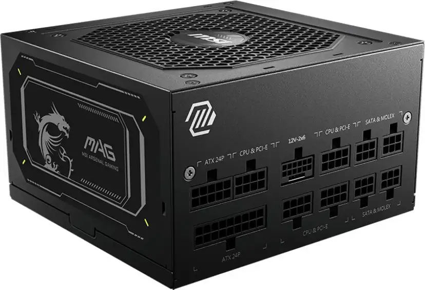 Блок питания MSI MAG A750GL PCIE5 II обеспечивает мощность 750 Вт и совместим с современными стандартами, такими как ATX12V 3.1 и PCIe Gen 5.0. Он обладает высокой эффективностью с КПД 90% и сертификацией 80 PLUS Gold, что помогает экономить электроэнергию и снижает нагрев. Этот блок полностью модульный, он позволяет подключать только необходимые кабели, что упрощает сборку и организует кабели внутри корпуса. Он оснащен одним 120 мм гидродинамическим вентилятором, который эффективно охлаждает устройство без лишнего шума. В устройство встроены плотные кабели с плоским дизайном, что помогает лучше расположить провода и улучшить вентиляцию. Блок имеет одну линию +12V с максимальным током 62 А, что обеспечивает стабильную работу системы при высокой нагрузке. В комплект входят все необходимые кабели, включая кабели PCIe Gen 5.0 и SATA, а также кабель питания питания от сети длительностью 0.6 м. Благодаря активной коррекции фактора мощности устройство стабильно работает в разных условиях электросети.