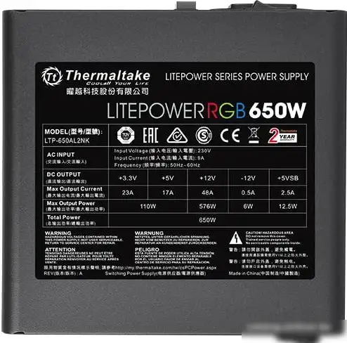 Блок питания Thermaltake Litepower RGB 650W предназначен для геймеров и обеспечивает стабильную работу системы. Мощность 650 Вт позволяет подключать требовательные компоненты. Он соответствует стандарту ATX12V 2.3 и оснащён одной линией +12V с максимальным током 48 А, что обеспечивает хорошую стабильность питания. В блоке есть активная коррекция фактора мощности (PFC), что помогает снизить энергопотери. Размер вентилятора 120 мм обеспечивает тихую работу и хорошее охлаждение. Многоцветная подсветка вентилятора создаёт привлекательный внешний вид. В корпусе есть разъёмы для подключения всех необходимых компонентов — материнской платы, процессора, видеокарт, накопителей и приводов. Кабель питания длиной 0.45 м подходит для сборки в большинстве корпусов. Этот блок питания не модульный, что немного усложняет кабельное управление.