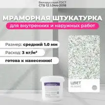 Мраморная штукатурка Байрамикс MIX 10.14WG, соответствует требованиям стандарта СТБ 1263-2001, имеет сертификацию для использования как внутри помещений, так и снаружи зданий. Возможна колеровка цвета по индивидуальному заказу.