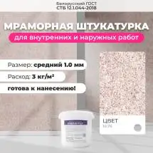 Мраморная штукатурка Байрамикс MIX, соответствует требованиям стандарта СТБ 1263-2001, имеет сертификацию для использования как внутри помещений, так и снаружи зданий. Возможна колеровка цвета по индивидуальному заказу.