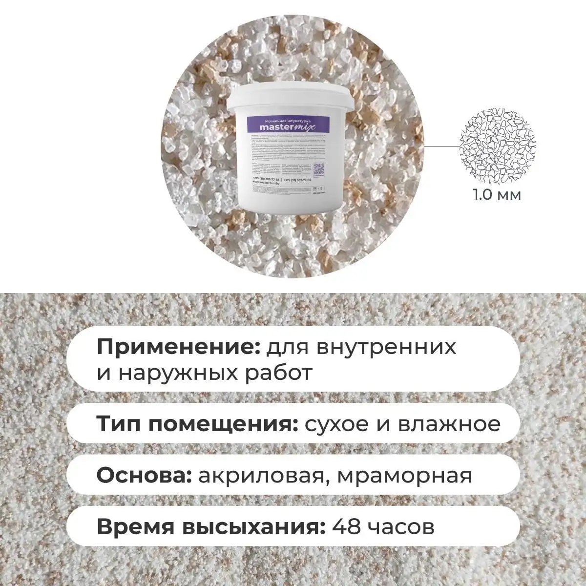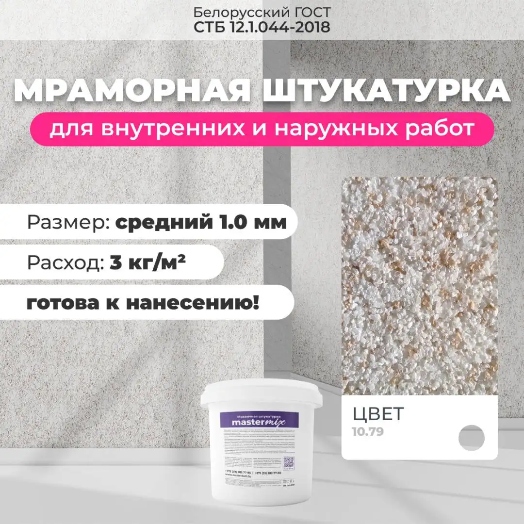 Мраморная штукатурка Байрамикс MIX, соответствует требованиям стандарта СТБ 1263-2001, имеет сертификацию для использования как внутри помещений, так и снаружи зданий. Возможна колеровка цвета по индивидуальному заказу.