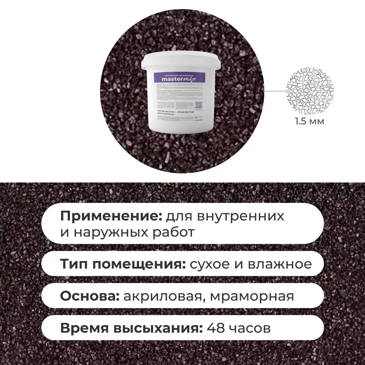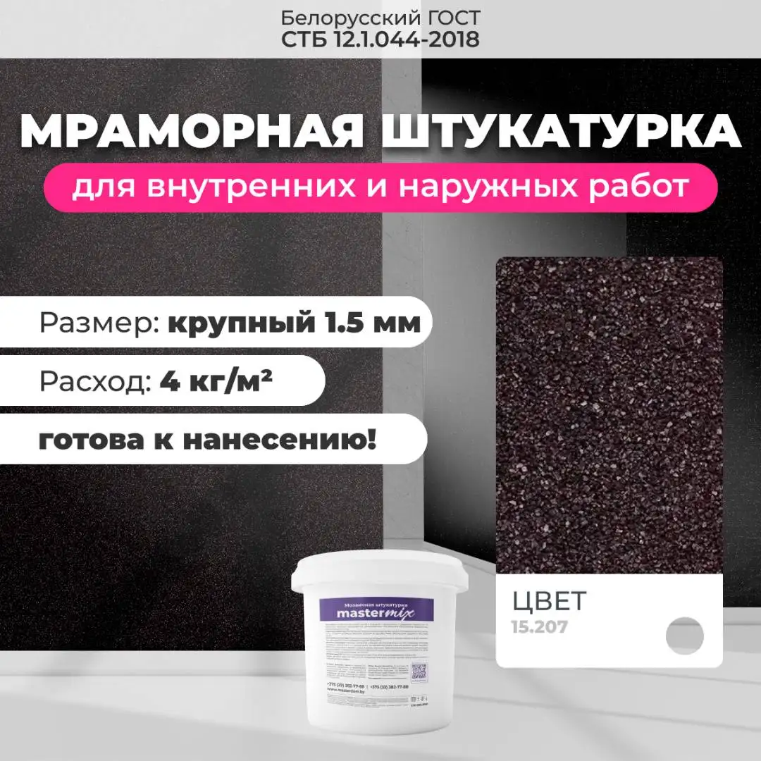 Мраморная штукатурка Байрамикс MIX, соответствует требованиям стандарта СТБ 1263-2001, имеет сертификацию для использования как внутри помещений, так и снаружи зданий. Возможна колеровка цвета по индивидуальному заказу.