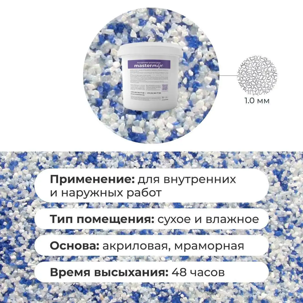 Мраморная штукатурка Байрамикс MIX, соответствует требованиям стандарта СТБ 1263-2001, имеет сертификацию для использования как внутри помещений, так и снаружи зданий. Возможна колеровка цвета по индивидуальному заказу.
