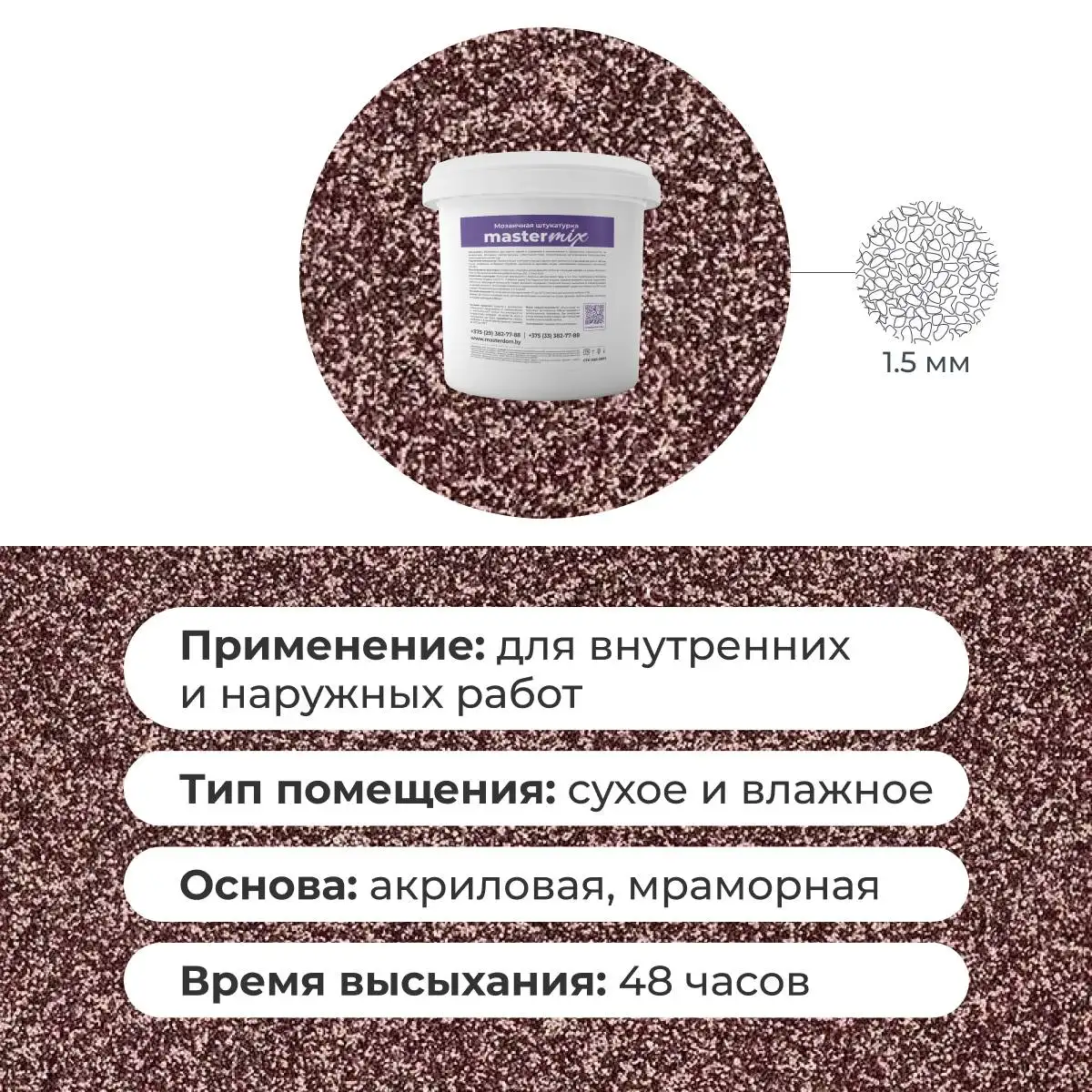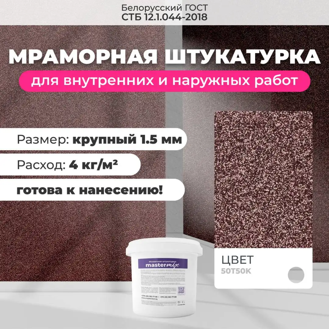 Мраморная штукатурка Байрамикс MIX, соответствует требованиям стандарта СТБ 1263-2001, имеет сертификацию для использования как внутри помещений, так и снаружи зданий. Возможна колеровка цвета по индивидуальному заказу.