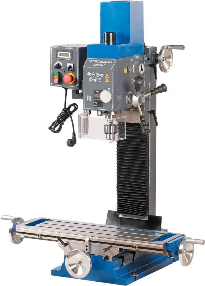Станок Nordberg NDM3047 — это универсальный фрезерно-сверлильный инструмент для обработки металла и дерева. Он подключается к электросети и работает от 220 В, имея мощность 1100 Вт. Устройство позволяет выполнять сверление и фрезерование с точностью благодаря полуавтоматическому управлению. Стол станка имеет размеры 425х215 мм по осям X и Y и 360 мм по оси Z, что обеспечивает комфортную работу с материалами разного размера. Положение материала легко регулируется по углу наклона для выполнения сложных задач. Максимальный ход пиноли — 70 мм, а скорость вращения достигает 2250 об/мин, что повышает эффективность обработки. У станка есть лампа подсветки для лучшей видимости рабочего пространства. Отсутствие охлаждения и пылесборника делает его простым в использовании и обслуживании. Также важно, что он обладает компактными размерами, длиной рабочего стола 700 мм и шириной 210 мм.