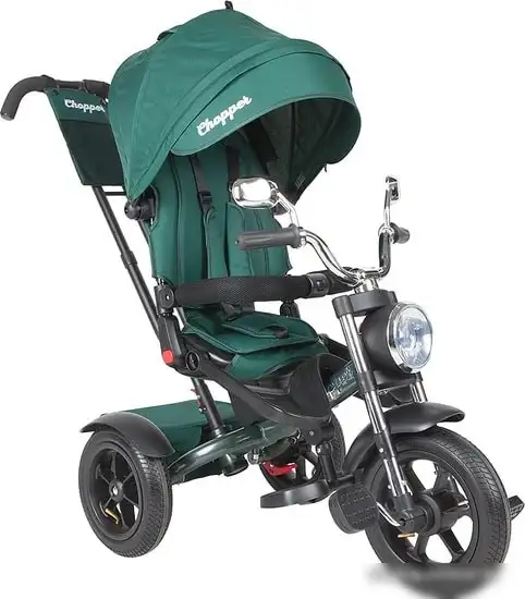 Детский велосипед Chopper CH1G подойдет для мальчиков и девочек. Он имеет поворотное сиденье с регулируемой спинкой и ремнями безопасности, что обеспечивает комфорт и безопасность. В комплект входит удобная ручка для родителей, которая помогает управлять велосипедом. На передней вилке установлена амортизационная система, которая сглаживает неровности дороги. Колеса диаметром 10 и 12 дюймов выполнены из надувных материалов, что увеличивает устойчивость и мягкость хода. Задние колеса оснащены стопором, предотвращая нежелательное движение. В конструкции есть передний и задний щитки, а сзади расположена корзина для личных вещей. В комплекте также есть зеркала и световые эффекты, повышающие безопасность. Кроме того, велосипед оснащен музыкальным блоком для развлечения, фонарем и сумкой на ручке.