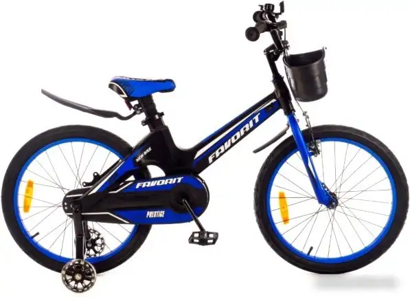 Детский велосипед Favorit Prestige PRS-20BL создан для мальчиков ростом 110-125 см и возрастом 6-11 лет. Он оснащён прочной рамой из магниевого сплава и надувными колёсами диаметром 20 дюймов, что обеспечивает плавное катание и хорошую амортизацию. Велосипед имеет один скоростной режим и передний механический тормоз, а также задний ножной тормоз для безопасной остановки. Передний и задний щитки, защита цепи и корзина спереди делают поездки комфортными и безопасными. Приставные колёсаи помогают начинающим велосипедистам держать равновесие. В комплекте есть звонок для оповещения окружающих и задний флажок для видимости. Управление осуществляется через руль без ручки, задние колёсa не блокируются, что препятствует падениям при остановках. Сиденье обычное, без дополнительных ремней безопасности или подлокотников, и отсутствует складная рама. Этот велосипед идеально подходит для начинающих и в дальнейшем прослужит долго благодаря надёжной конструкции и вместительной корзине спереди.