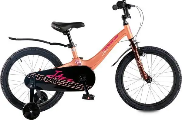 двухколесный велосипед с приставными колесами для девочек, возраст: 5-7 лет, рост: 105-115 см, сиденье: обычное (седло), колеса 18'', рама: магниевый сплав, вилка жесткая
