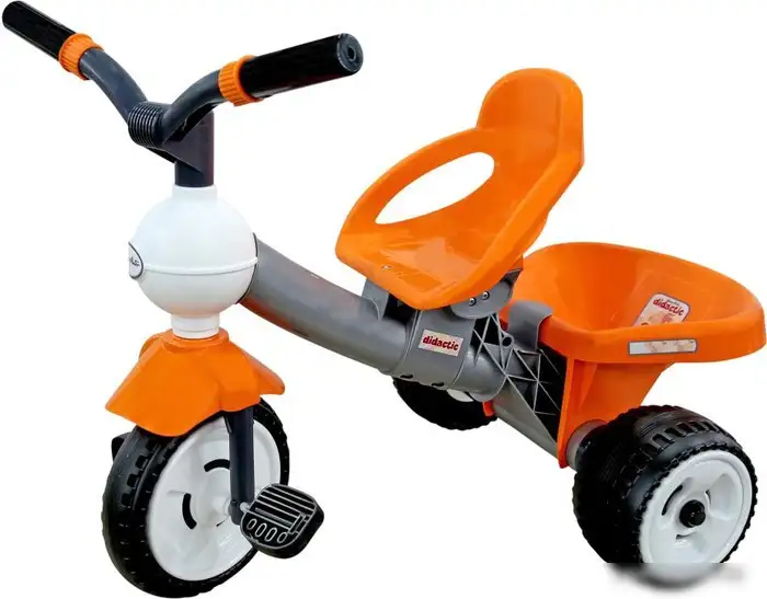 Детский велосипед Полесье Дидактик предназначен для малышей от 2 лет и подходит как для мальчиков, так и для девочек. Он оснащён устойчивыми цельными колёсами и тремя колесами, что помогает ребёнку уверенно держать равновесие. Велосипед не имеет ручки управления, тормозов и дополнительных элементов, таких как ремни безопасности или страховочный обод, что делает его простым и лёгким в использовании. Он оснащён крепким и комфортным сиденьем с постоянной спинкой, которое обеспечивает поддержку ребёнка во время езды. На раме есть передний щиток и корзина сзади, куда можно положить небольшие вещи или игрушки. Велосипед украшен яркими оранжевым и серым цветами, что делает его привлекательным для малышей. Для безопасности есть задний и передний колесные щитки, а также застёжка-заклёпка на заднем колесе. Он предназначен для развития моторики и балансирования у маленьких детей.