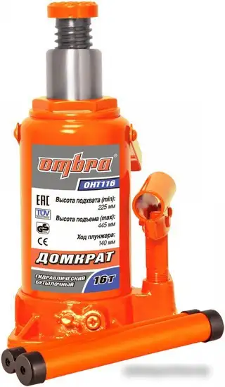 Бутылочный домкрат Ombra OHT116 предназначен для подъёма грузов до 16 тонн. Он работает на гидравлическом механизме, что облегчает процесс подъёма и делает его более удобным. Максимальная высота подъема составляет 445 мм, а минимальная — 225 мм, что позволяет использовать его на разной высоте. Домкрат не поставляется с сумкой или кейсом для хранения, поэтому его можно хранить в любом месте. Он отлично подходит для автосервисов и ремонта грузовых транспортных средств.