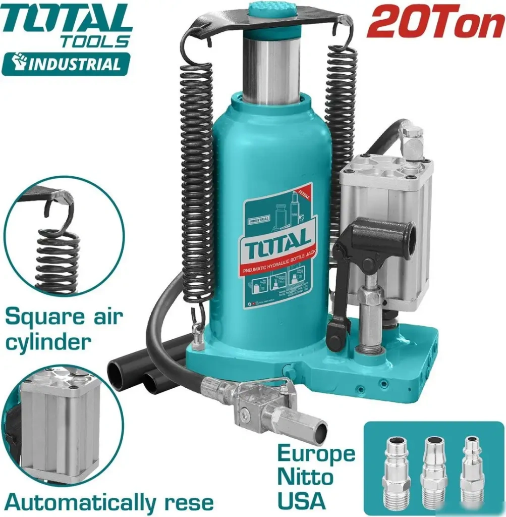 Этот бутыльный домкрат Total THT109206 предназначен для поднятия грузов весом до 20 тонн. Он работает на пневмогидравлическом механизме, что обеспечивает легкое и удобное управление. Максимальная высота подъема составляет 500 мм, а минимальная — 255 мм, поэтому он подходит для различных задач. Вес устройства — 17 кг, оно легко переносится и используется в разных условиях. Надежное выполнение работы достигается за счет прочной конструкции и качественных материалов. Домкрат не включает в комплект сумку или кейс для хранения. Его монтаж и эксплуатация просты благодаря четкой конструкции. Высокая грузоподъемность и универсальность позволяют использовать его в автосервисе и для других целей. Домкрат обеспечивает стабильность и безопасность при подъеме тяжестей.