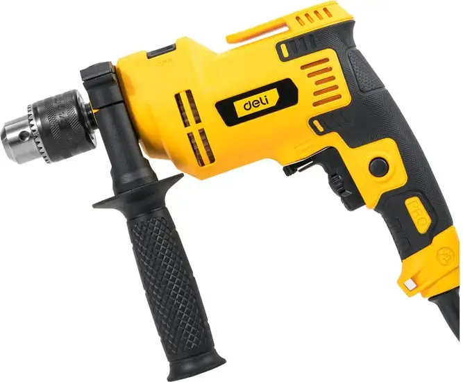 Ударная дрель Deli DL-CZ13-E1 мощностью 650 Вт идеально подходит для сверления в различных материалах. Она работает в двух режимах: сверление и сверление с ударом, что делает её универсальной для дома и стройки. Патрон стандартного размера 0–13 мм позволяет использовать различные сверла, а максимальная скорость вращения — 3 000 об/мин. Частота ударов достигает 48 000 ударов в минуту, что обеспечивает эффективное сверление кирпича, металла и дерева. Регулируемая скорость позволяет настроить работу под задачу, а дополнительная рукоятка помогает держать инструмент удобно и безопасно. В дрели есть функция реверса, фиксатор кнопки включения и ограничитель глубины сверления. Простая и прочная конструкция облегчает работу, а съемная рукоятка и упаковка в кейсе делают транспортировку и хранение удобными. Это устройство надежно и хорошо справляется с бытовыми и строительными задачами.