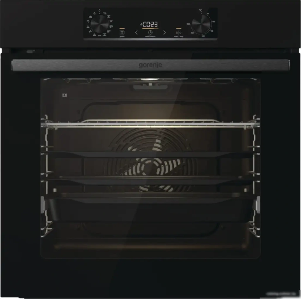 Электрический духовой шкаф Gorenje BPS6737E07B выполнен в чёрном цвете и предлагает возможность полноразмерного приготовления пищи. Он использует энергию класса A+ и подключается мощностью 3 500 Вт. Объём духового шкафа составляет 77 литров, что подходит для больших порций. Управление осуществляется через светодиодный экран, а функция плавного закрывания и таймер делают работу удобной. Блок управления включает отложенный старт, звуковой сигнал, термостат и освещение внутри камеры. В шкаф встроены 12 режимов работы, среди которых гриль, конвекция, размораживание и другие. Особенностью является функция AirFry и круговой нагревательный элемент с паром. В комплект входят три противня и решетка, а надёжная пиролитическая очистка облегчает уход. Дверца с четырьмя стеклами обеспечивает хорошую теплоизоляцию. Благодаря современным функциям, шкаф удобно использовать для разнообразных рецептов и больших объёмов.
