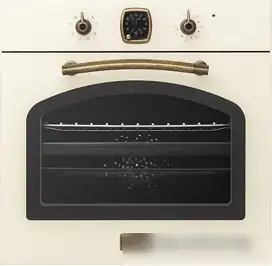 Электрический духововой шкаф Korting OKB 481 CRB имеет объем 67 литров и класс энергопотребления A, что позволяет экономить электроэнергию. Управление происходит механическими рычагами, а аналоговая индикация помогает легко контролировать процесс приготовления. Шкаф оснащен 8 режимами работы, включая нижний и верхний нагрев, гриль, конвекцию и их комбинации, что делает его универсальным для различных блюд. Встроенная каталітична очистка задней стенки помогает поддерживать чистоту внутри устройства. Есть телескопические и проволочные направляющие для удобства использования противней и решеток. Освещение внутри позволяет следить за процессом готовки, а также установлен таймер с звуковым сигналом. Благодаря современному дизайну в стиле ретро он отлично впишется в любую кухню. Размеры подходят для стандартной ниши, а вес 38 кг обеспечивает стабильность. Аппарат не имеет функции приготовления на пару или автоматических программ, зато его конструкция проста и удобна в использовании.