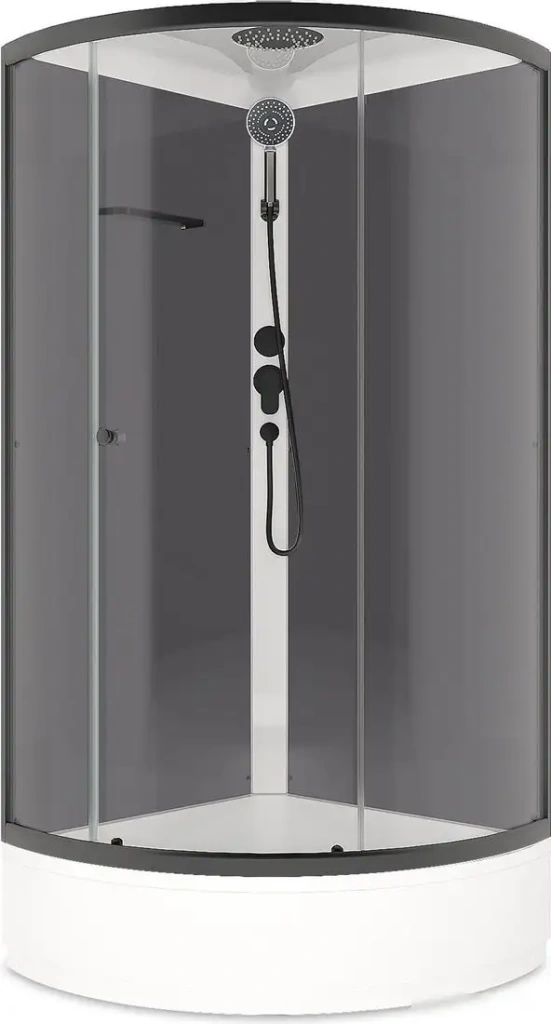 Душевая кабина Domani-Spa Simple 99 Mid 90x90 DS01Sm99MGrCl00.Gt-V1.2-Black создаёт комфорт в вашей ванной комнате. Она рассчитана на одного человека и устанавливается в угол между стенами. Стенки сделаны из закаленного стекла и алюминия, а двери раздвижные, что удобно при ограниченном пространстве. Высокий поддон с закруглённым краем и невысокой стенкой 28 см обеспечивает безопасное использование. В кабине есть верхний тропический душ и ручной душ, что позволяет выбрать предпочитаемый режим мытья. Внутри расположены полки для хранения косметики, а также есть смеситель для удобства. Простая сборка без силиконовых герметиков. Для безопасности покрытие дна противоскользящее. Кабина не оснащена функциями бани или массажных систем, но обеспечивает стандартный душевой комфорт.