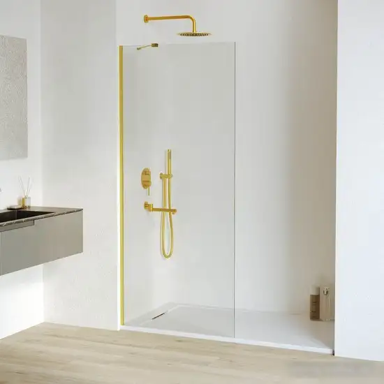 Душевая стенка RGW WA-110Gb имеет размеры 100 см в ширину и 195 см в высоту, что делает её удобной для большинства ванных комнат. Она устанавливается в угол, соединяя две стены для более компактного размещения. Стенки и двери выполнены из закаленного стекла толщиной 8 мм, что обеспечивает надежность и безопасность при использовании. Золотой профиль придает изделию стильный и современный внешний вид, а прозрачное стекло делает пространство более светлым и открытым. Душевая стенка не включает поддон, что позволяет выбрать удобный для вас вариант основания. Она легко монтируется и занимает минимум места, не мешая движению в ванной. Благодаря долговечному материалу и современному дизайну, стенка прослужит долго без потери внешнего вида.