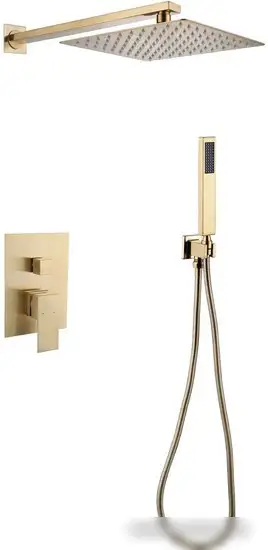 Душевая система Abber Daheim AF8219G выполнена в стильном матовом золотом цвете. Она предназначена для настенного монтажа и включает верхний душ с диаметром 250 мм, а также ручной душ с одним режимом работы. В комплект входит держатель лейки, шланг и удобный смеситель. Верхний душ расположен на шарнире, что позволяет регулировать его угол. Размеры системы делают её компактной и удобной для использования. Эта система combines красивый дизайн с простым управлением, что делает её хорошим выбором для любой ванной комнаты.