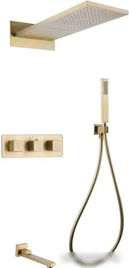 Душевая система Abber Daheim AF8253G выполнена в элегантном матовом золотом цвете и предназначена для настенного монтажа. В комплект входит верхний фиксированный душ в форме прямоугольника с шириной 230 мм и возможностью регулировки длины, а также ручной душ с одним режимом и прямоугольной формой. В системе есть термостатический смеситель, который помогает поддерживать постоянную температуру воды. В набор также входит держатель для ручного душа, шланг, излив для ванны и все необходимые крепления.