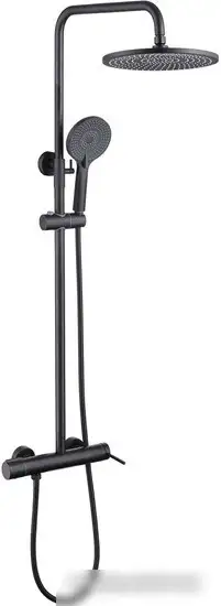 Душевая система Abber Emotion AF8816B в черном матовом цвете подойдет для установки на стену. В комплект входит верхний душ диаметром 25 см, ручной душ и все необходимые держатели и шланги. Верхний душ крепится на шарнире, что позволяет менять угол направления струи. В системе есть механический смеситель и вентиль для удобства использования. Конструкция включает также излив для ванны, если вам нужно совместить функцию душа и ванны. Благодаря простому дизайну и надежной сборке, эта система прослужит долго и легко в использовании. Вот основные особенности:
